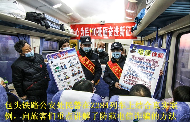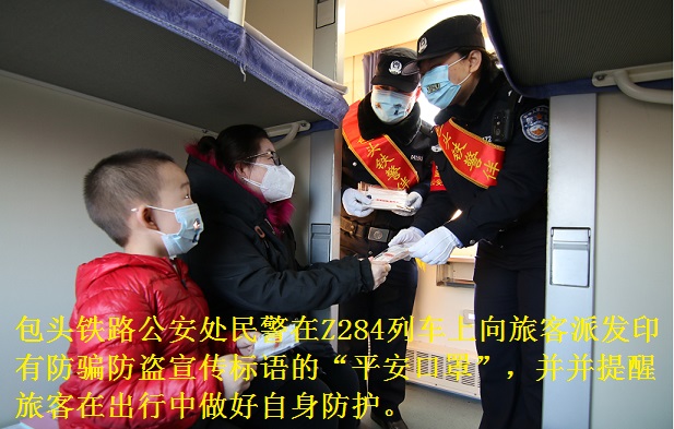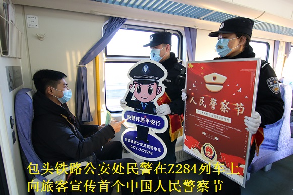 在首个“中国人民警察节”到来之际,包头铁路公安处民警在多趟值乘列车上开展安全出行宣传,向乘车旅客派发印有防骗防盗宣传标语“平安口罩”,结合真实案例,向旅客们重点讲解了防范电信诈骗的方法,并提醒旅客在出行中做好自身防护。