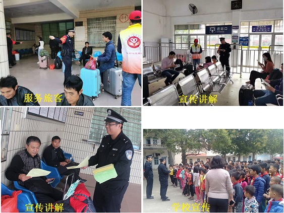 “大家知道吗,座机电话和手机停机状态下也能拨打110,拨通110报警电话后,如您需要报警求助,请按接警员的提示如实回答问题,并在报警地等候民警,保持手机畅通,以便民警能迅速、准确地找到您”。民警正热情向同学们、旅客们宣讲拨打110的主要知识。