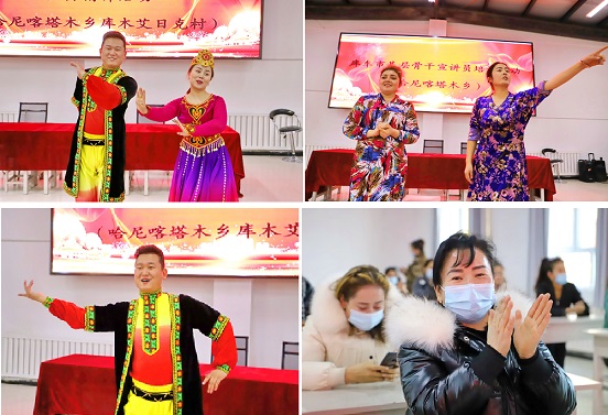 1月8日, 库车市宣传部宣传队成员在哈尼喀塔木乡通过文艺演出的形式为群众宣传全会精神。冬闲时节,该市组织10余名基层草根宣讲员组成特色宣传队,深入企业、农村、社区等公共场所,向各族群众宣讲党的第十九届五中全会精神,受到大家一致好评。