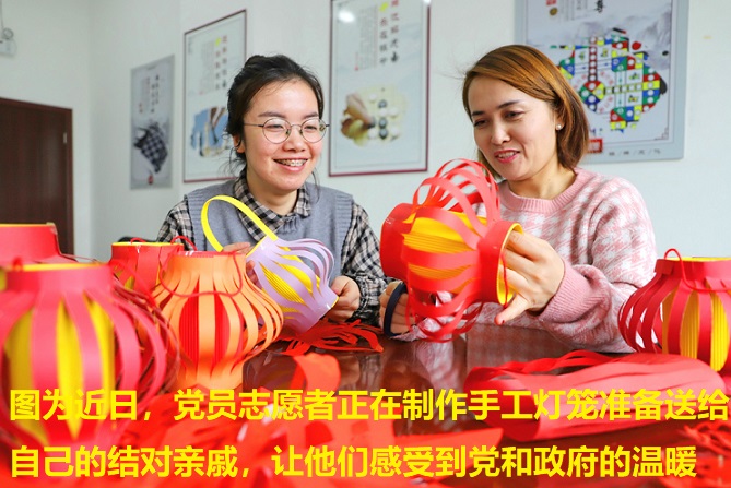 1月19日,新疆库车市委组织部党员志愿者正在制作手工灯笼准备送给自己的结对亲戚。春节临近,该市开展形式多样的“送温暖 送祝福”活动,让各族群众感受到党和政府的温暖。