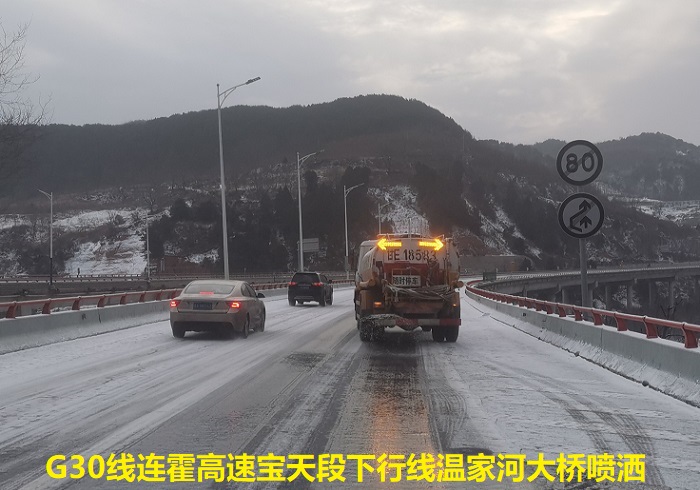 清风网讯(通讯员:胡泽庭)日前,在G30线连霍高速公路宝天段下行线温家河大桥段,天水公路局高养中心联合养护企业采用有机液体融雪剂进行桥面除雪作业,这是天水市高速公路首次采用该新材料进行道路除雪防滑作业。