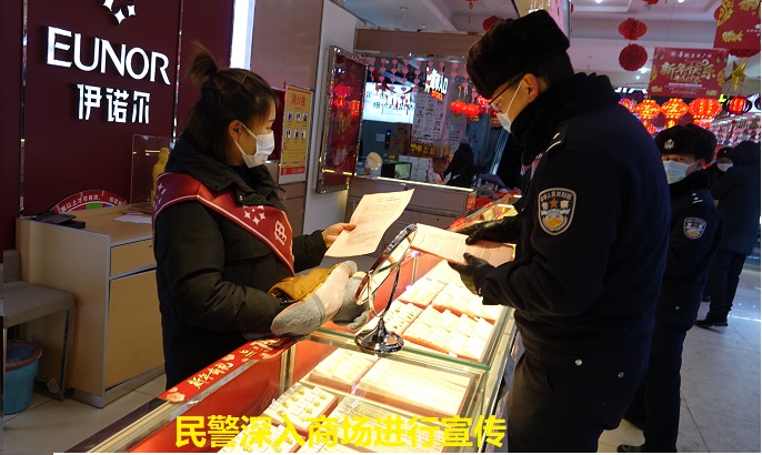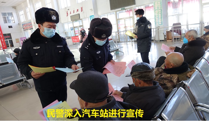 在车站、超市,民警积极开展法制宣传。“看,那里人多,咱们去那!”派出所民警说。春运期间,人流量大,正是侵财案件多发的时候,民警们深入到群众中,向群众们讲解预防侵财案件的各类小知识,防止人民群众财产受到损失。