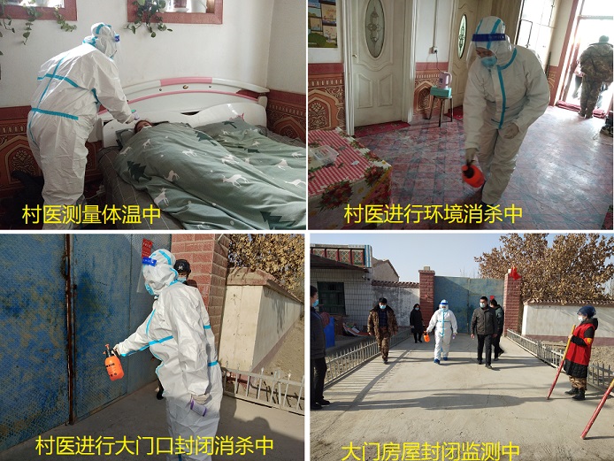 此次演练模拟托万克巴格托格拉克村居民阿某12月底由成都乘飞机返回阿克苏地区,按疫情防控规定实施了“14+7+7”隔离,1月22日由家人的私家车接回家中,1月23日16时阿某出现呼吸道症状,并立即佩戴口罩向村委会报告。村委会接到通知,立即按照预案向上级报告同时开展流行病学调查、终末消毒等。