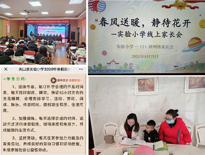 清风网讯 (通讯员:余海霞 张荣光)2021年1月22日,期末考试结束,英山县实验小学两校区五千多名学生安全离校。按上级疫情防控要求,1月19日,学校发放《英山县实验小学2020年度寒假致家长的一封信》,对学校期末工作和寒假疫情防控、学生行为、学生安全作了周密安排并提出了具体要求,制定《家长公约》与《学生公约》对家长和学生进行疫情防控、学生品德方面的提醒和教育。