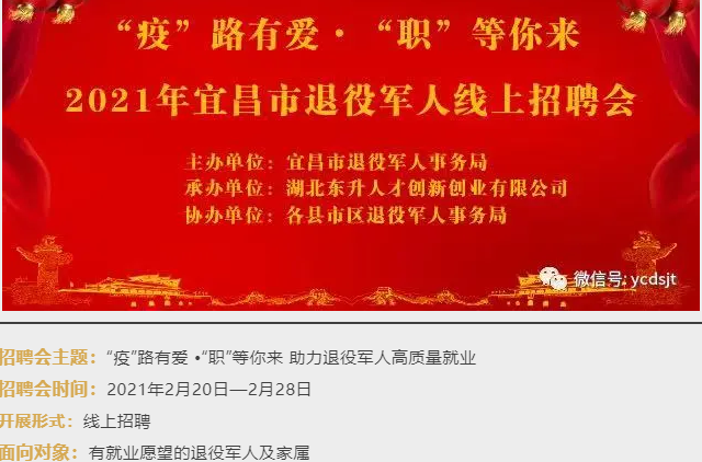 清风网湖北讯(通讯员:姜生华)关爱退役军人,搭建就业平台。2月20日至28日,湖北省当阳市退役军人事务局积极组织辖内退役军人及家属参加宜昌市“‘疫’路有爱 •‘职’等你来”线上招聘会活动。