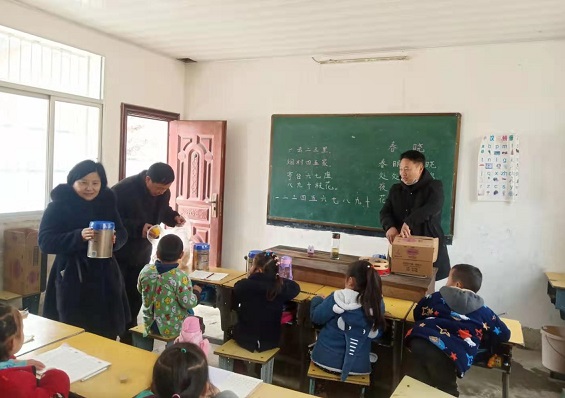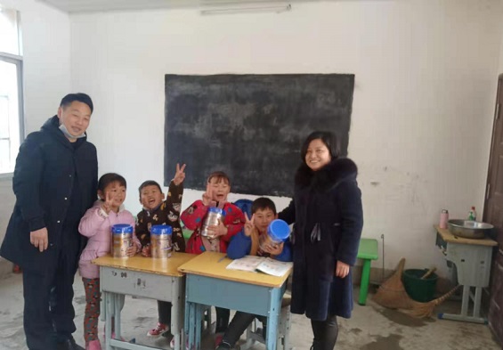 汪校长和王主任、张主任走进课堂,亲手送上自费购买的奶粉和点心。