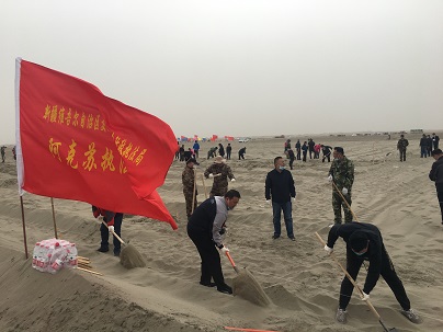 经过2个多小时的车程终于赶到植树造林基地,一片戈壁荒漠展现在眼前,人声鼎沸,汽车轰鸣。劳动现场大家热情高涨,领导们身先士卒,党员们更是干劲十足。分工协作,密切配合,不怕苦,不怕累,你追我赶,挥汗如雨,有的打桩,有的拉线,有的挖坑,有的填土,有的栽树,渴了喝口凉水,饿了啃口干馕。经过一天的辛勤劳动,终于在黄昏时分圆满完成义务植树任务。