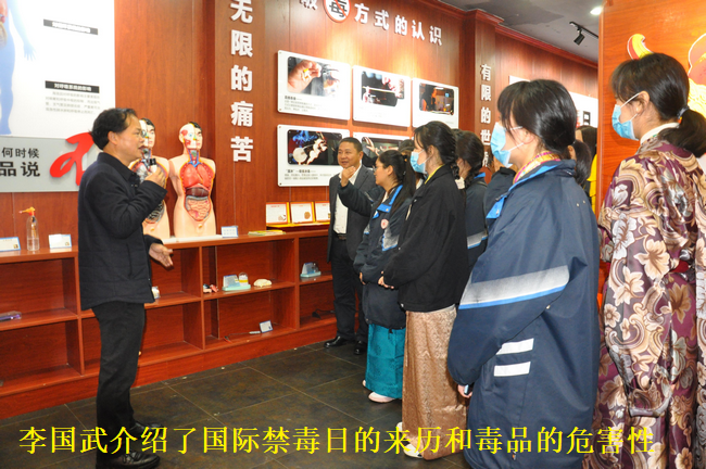 一大早,穿着藏族服装的同学们在全国道德模范、岳阳市禁毒协会副会长李国武带领下首先参观“禁毒警示馆”。 在各个展区,李国武介绍了国际禁毒日的来历、毒品的种类和危害性,向同学们讲解如何进行识别、防范、拒绝毒品等方面的知识。