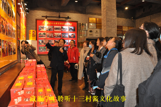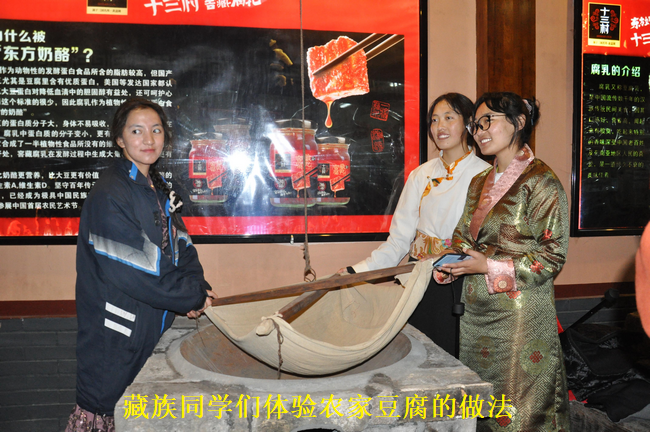 最开心的是参观十三村酱文化博览园,藏族同学们在岳阳阿爸、阿妈陪同下,兴致勃勃穿梭于百果园、笑脸墙、“德”字碑、天下第一坛、古代“宝马”车等景点,大开眼界。尤其是目睹“舌尖上的非遗”食品生产过程,感慨道:平时经常吃的香菇酱出生地如此天然生态、文化底蕴如此深厚。