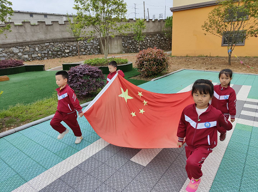出旗音乐声中,护旗手们步履铿锵、大步向前。交接,升旗,行注目礼。鲜艳的五星红旗徐徐升起,全场的小朋友们伴随着乐曲和老师们一起唱起了国歌,歌声虽然稚嫩但依然嘹亮。国旗迎风飘扬,昭示着孩子们在幸福的时代快乐健康成长。