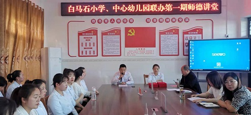 清风网讯(通讯员 段祯祯)“向着明天,向着太阳,向着辉煌,勇往直前!”4月30日下午,英山县杨柳湾镇白马石小学和杨柳湾镇中心幼儿园全体教师齐聚白马石小学报告厅,开展“立师德、铸师魂,做合格人民教师”主题师德讲堂活动。该镇中心学校校长谭旭,陈出新教研及桥头边村支书吴鹏等一行3人到会观摩指导点评。