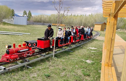 随后,干部群众一起游家乡——驼鸵公园,一起做游乐火车,观赏孔雀、马匹、鸵鸟等动物,感受自己的家乡在党和政府的关怀支持下发生的翻天覆地的变化。