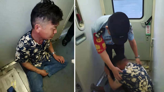 值乘列车的怀化铁路乘警黄泽文此时正在巡视车厢,在14号车厢接到旅客的情况报告后,快步走到了15号车厢。一进车厢内就看见了一名男子正在用头部撞击地板,乘警黄泽文几大步地跨上去拉住了该男子。