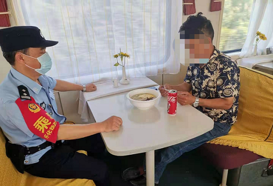 为详细地了解情况及劝慰该男子,乘警将他请到了餐车坐在他的对面,并给该男子送上了一瓶饮料,在得知该男子喝酒后还没吃饭,又给该男子送上了一碗面条。