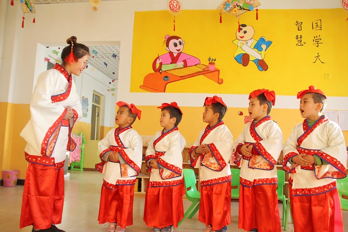 6月26日,新疆库车市乌尊镇第五幼儿园老师正在教小朋友们学习国学礼仪。近年来,库车市将民族传统文化教育融入日常教学实践中,创新开设民族文化特色课堂,孩子们在特色课中学习传承民族传统文化,感受民族文化的魅力。吴乐摄
