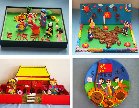 同学们的作品构思新颖、有创意,整体设计效果美观精致,原创作品源于生活,充分利用废旧物品。生活中的废弃物,在同学们一双双灵巧的手中,制作出了一件件创意无限、匠心独特的精美装饰品或生活用品,让生活中的废弃物重新变成了各种各样的“宝贝”。有的用纸盘做成挂饰、用纸盒做天安门城楼、用废纸做小灯笼、用橡皮泥捏成地图等,一件件丰富多彩的作品充分展示了学生的潜能,又让他们从生活中发现美、感受美、创造美,同时表达了同学们的热爱祖国、热爱家乡、民族团结一家亲的情怀。