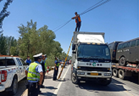 2021年7月1日上午10时许,沙雅执法大队执法人员在对S211线例行巡查中发现,位于S211线K32路段内车流量较大且通行缓慢,存在拥堵现象。沙雅执法大队执法人员立即提高警惕,谨慎驾驶,到达事发地后,发现一辆超高半挂货车,拉运设备从新和往沙雅方向行驶至K31+120米处,车上设备不慎挂到低空悬挂的通信线,受巨大张力影响,路边木质电杆被拽断且挂于车上,存在极大安全隐患。
