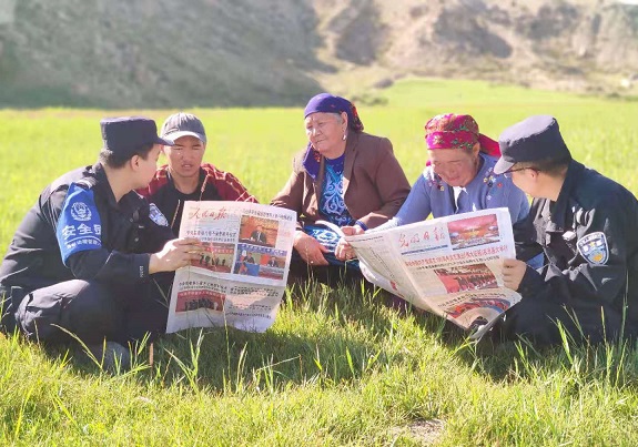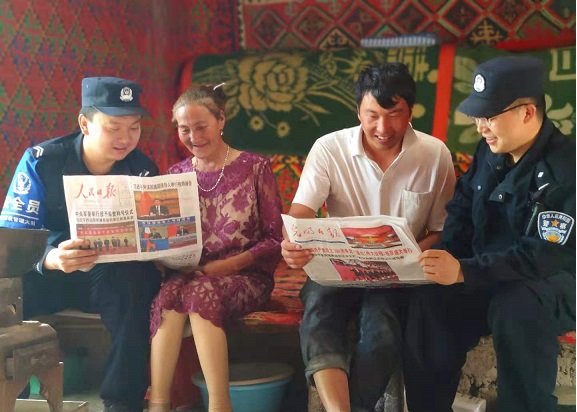 “民警们带着总书记“七一”讲话精神来到我们这里,用我们听得懂的语言宣传解读,让我们知道了很多好的政策以及党的光辉历程。现在党和国家对我们少数民族无微不至的关心关爱,让我们倍感温暖,我们一定会搞好牧业生产、发家致富,以后的生活一定会越过越好。”辖区牧民托合托吾力激动地说道。