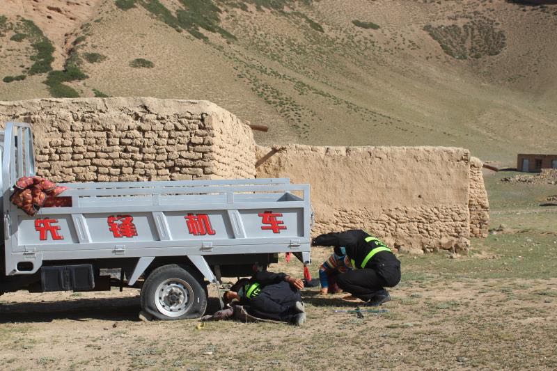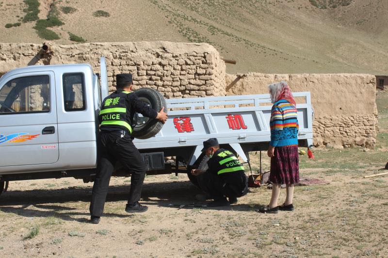 2021年7月9日下午15时许,托云边境派出所民警接到辖区群众求助称:群众的皮卡车在库瓦特村村委会后面轮胎爆胎了,请求警务室民警帮助。