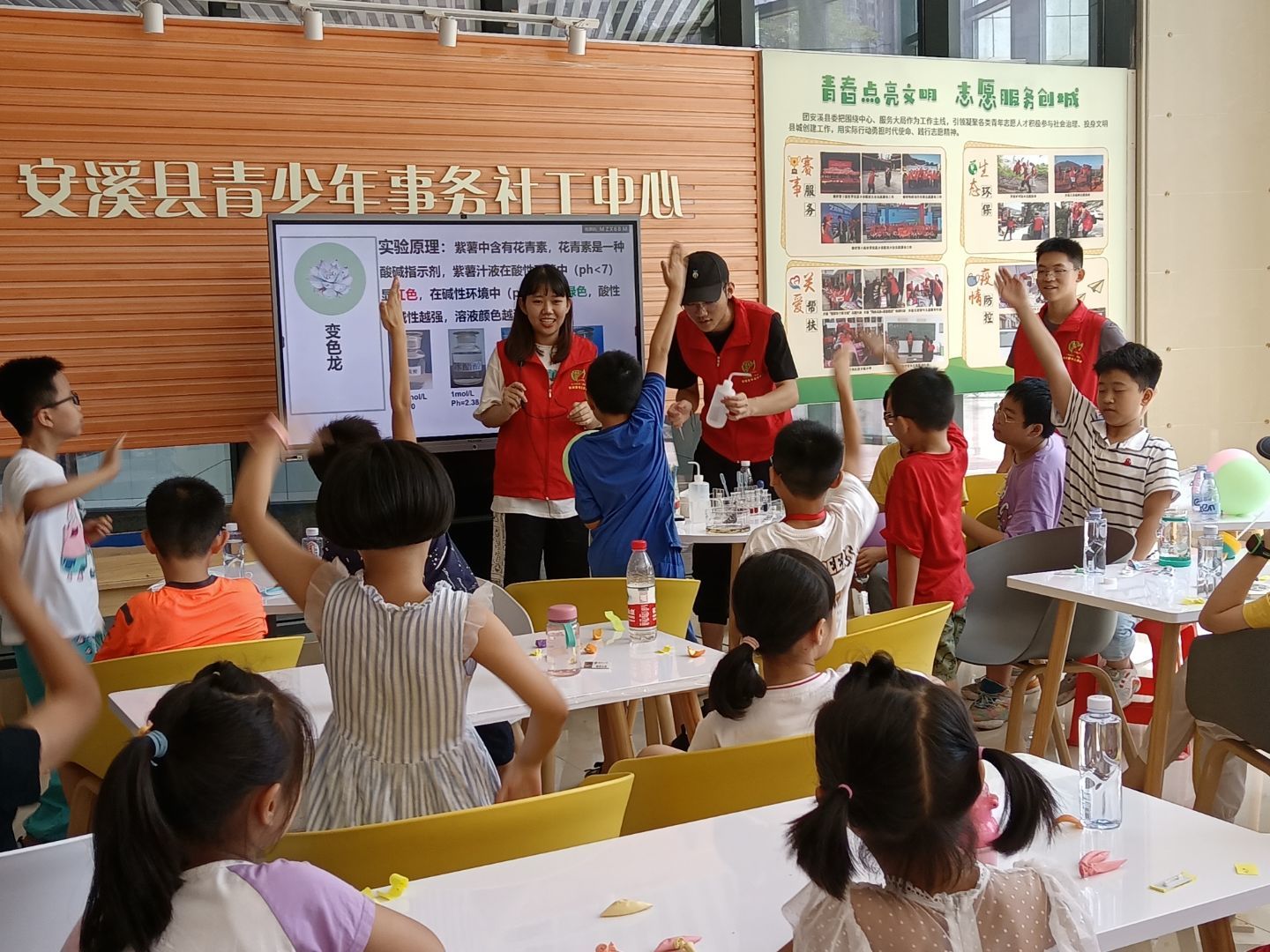 7月13日,由共青团安溪县委指导,福州大学“探索藤铁新发展,助力文化扬四海”实践队与福建商学院、无锡太湖学院志愿服务队联合主办,安溪县青少年事务社工中心、安溪县茜茜公益协会协办的“七彩课堂”主题活动顺利开展。此次活动围绕化学知识科普、党史教育、宣传资助育人“三行”活动和茶叶文化进行。活动中实践队通过有趣的化学实验—蓝瓶子、变色龙及化学发光等激发了同学们对化学的兴趣和热情,实验过程中小朋友们积极参与互动,现场气氛相当活跃。通过本次活动,丰富了孩子们的假期生活,真正的将为人民做好事落实到了实处,得到了孩子、家长的 一致好评!