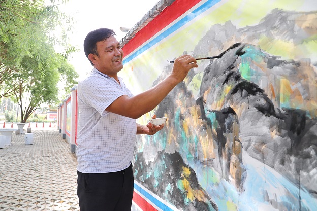 8月4日,新疆库车市比西巴格乡科克提坎村乡土画家正在手绘墙画。为深入推进美丽乡村建设,该村邀请乡土画家在村民房屋的外墙上进行艺术创作,绘制了一幅幅反映美丽乡村、乡风文明、厕所革命、邻里和谐等内容的墙体画,栩栩如生的艺术墙画为村庄增添了色彩,营造了独具特色的乡村文化氛围。