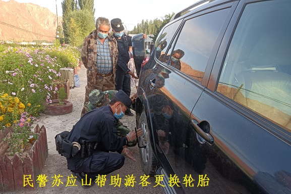 无独有偶,9月1日上午,塔村景区内一辆悬挂外地牌照的黑色轿车打着双闪停在了巡逻民警面前,游客向民警苏应山救助:“警察同志,能不能帮帮我,我的车右后轮胎进入景区后被东西扎破,现在还在漏气,我不会换备用轮胎,你能不能帮帮忙”。面对游客的求助,民警苏应山随即找出千斤顶、扳手等随车工具,一边支起车辆换备用轮胎,一边安慰游客,让她不要着急。经过十几分钟的忙活后,备用轮胎更换完毕了。“你可以先慢慢开一段试一试”民警苏应山说道。