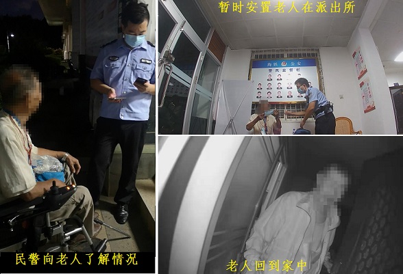 了解情况后,民警通过其随身携带的手机、电话本等物品中发现的电话号码尝试与张先生的家人取得联系,不料一直到当日夜间22时许,张先生的儿女电话始终无法接通,仅能联系到其远在吉林的妹妹。此时张先生感觉已十分疲惫,并多次想要趁民警不注意自行乘轮椅离开,幸好被民警发现及时制止。为了确保张先生安全,派出所只好抽派一名民警护送其乘坐出租车返回澄迈住处。然而抵达张先生指定的小区后,其又忘记了自己的具体房间位置,最终民警在出租车司机以及物业的帮助下才得以将张先生送回了自己的房间。离开前,民警将情况告知物业和当地居委会,建议对老人的安全予以更多的关注,并继续联系老人子女。