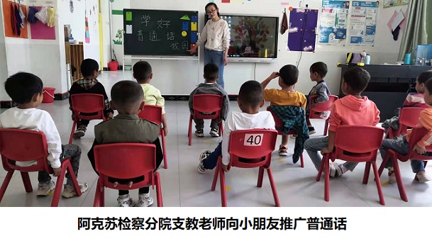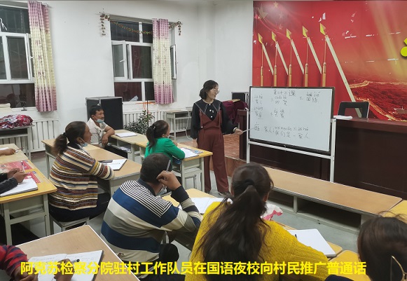 普通话是中华民族大家庭的通用语言,是维系民族团结的纽带,促进社会发展的桥梁。为了普及国家通用语言文字,阿克苏检察分院驻村工作队积极组织村民开展国语夜校,从汉语拼音和日常用语开始教,把提升农民群众的普通话基本交流能力作为目标,采取夜校学习集中教,农民自主学,干部常帮带等方式,引导群众积极学,大胆说,不断提升村民使用国家通用语言文字的能力。