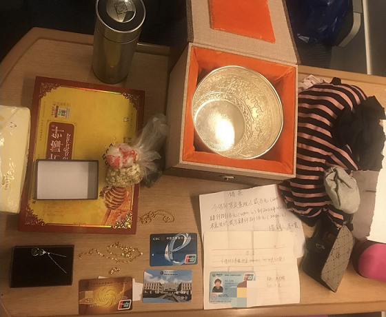 清风网讯(怀化铁路公安处乘警支队;刘燕轻、 谢文辉)9月20日,中秋假期第二天,怀化铁路乘警值乘的重庆西开往长沙南的G2152从列车贵阳东站开车后,乘警在1号车厢11B座位处的行李架上发现旅客遗留一个双肩包,乘警和列车长打开这个包一看,小惊了一下,内有金项链、金手链各一条,玉坠一个,银碗一个(商标卡上标注10400元)以及银行卡、社保卡和两张共计144800元的借条。乘警和列车长当即查实了有关信息,后将这个装有贵重物品的双肩包移交凯里南站转交前来认领的旅客。