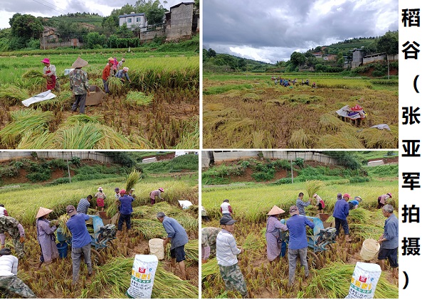 稻田翻浪,稻穗被压弯了腰,平村大寨组的村民们正在稻田里收割稻谷,你把稻穗割来,我把稻谷翻打,男男女女有说有笑,一起团结协作,把金灿灿的稻谷尽收袋中。