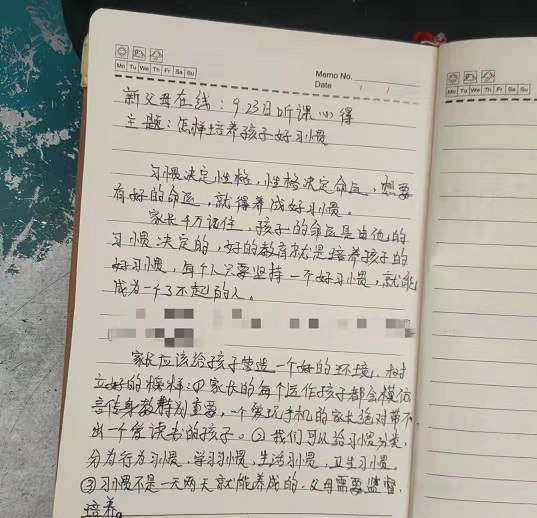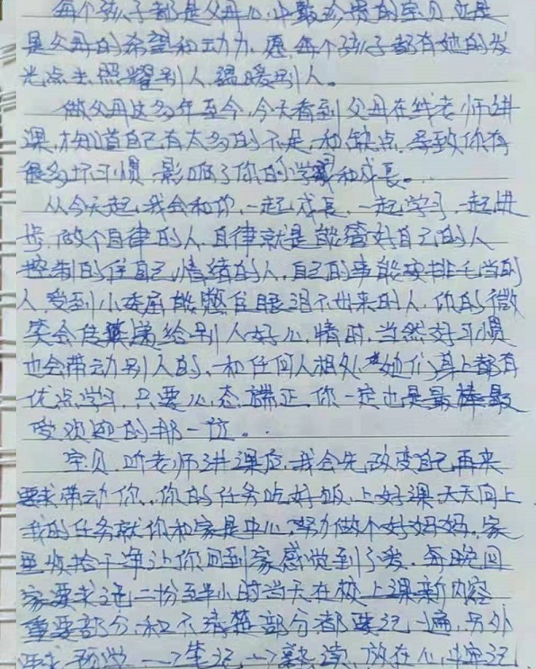 大部分家长在收看直播的同时,还写下了听课记录和心得体会,一位家长在体会中写道:(家长)的言传身教非常重要,一个爱玩手机的家长绝对带不出一个爱读书的孩子……有位家长听了直播课后,写下了自己对孩子的期望:“每个孩子都是父母心中最珍贵的宝贝,是父母的希望和动力,愿每个孩子都有她的发光点,照耀别人,温暖别人。”