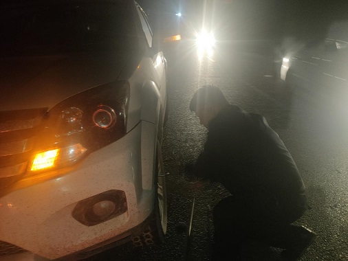 10月14日零点15分左右,阿克苏边境管理支队民警王嘉晨在返回单位途中发现漆黑的夜里一辆轿车停在路边打着双闪,而周围未摆放任何警示标志,车前一名男子站在路边向过往车辆招手拦停,10月的阿克苏深夜气温低,男子已经冻得瑟瑟发抖,看见警车驶来像是抓住救命稻草。