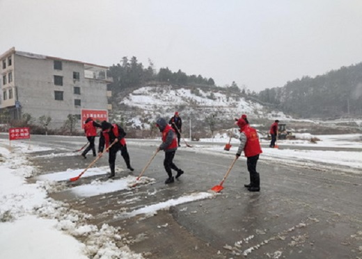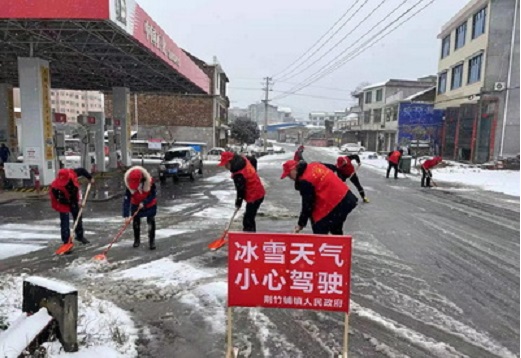 为确保冰雪天气行人车辆安全出行,12月26日下午,武冈市荆竹铺镇党委书记邓联文、镇长段了青带领20多名镇干部放弃周日休息,拿着铁锹、扫帚等工具来到辖内武马路主干道的长坡、急弯、交叉路口等重要路段。他们不畏严寒,顶着风雪,挥舞着铁锹清扫道路上的积雪。凛冽的寒风中,大家分工合作,有的拿着铁锹,铲冰除雪;有的拿着扫帚,清扫路面,好一番热火场面。