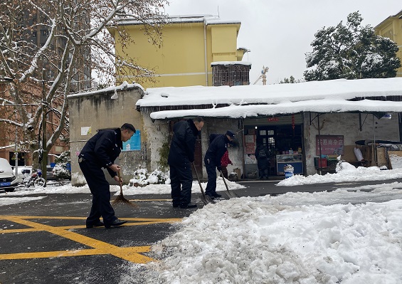 怀化火车西站派出所的民警们看到后,决定帮群众扫雪清路。民警们手拿铁镐和竹扫把,三人一组,分段清扫。经过近两个小时的劳动,由红星南路到怀南村的一段约60米长的路段上的积雪和冰块,被民警们清扫的干干净净,黑色的路面在旁边白雪的映衬下,颜色鲜明地显现了出来。