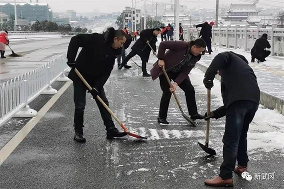 清风网讯(通讯员:戴修军)12月26日晚,武冈市全域范围迎来入冬以来第一场强降雪。降雪给人们的出行带来不便,增添了不少安全隐患,为确保居民安全出行,12月27日,武冈市辕门口街道办事处党政负责人带领党员干部、工作人员在辖区内积极开展清雪除冰,最大限度地减少降雪、低温对辖区交通、生产、生活造成的不利影响。