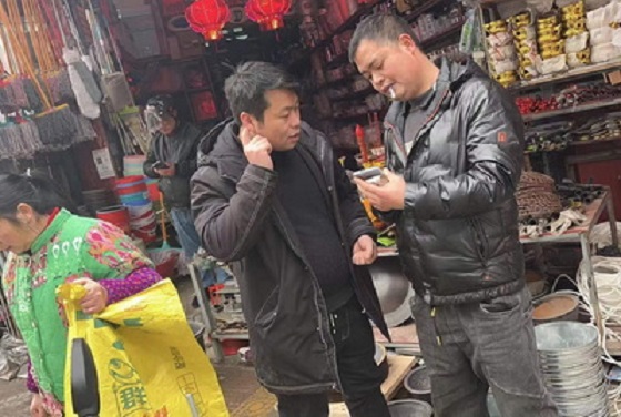 (图为:镇应急办工作人员指导商铺老板下载安装国家反诈APP)