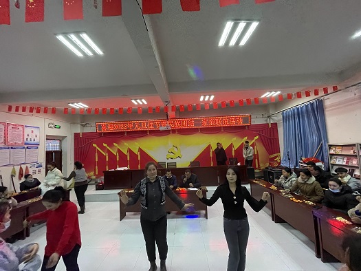 活动由文艺表演、十九届六中全会知识问答、抢板凳等环节组成。活动中、《歌唱祖国》、《我的中国心》、《刀郎麦西来甫》等精彩歌舞表演一次又一次赢得观众们的热烈掌声,独唱、吹气球比赛等活动把氛围推向高潮……