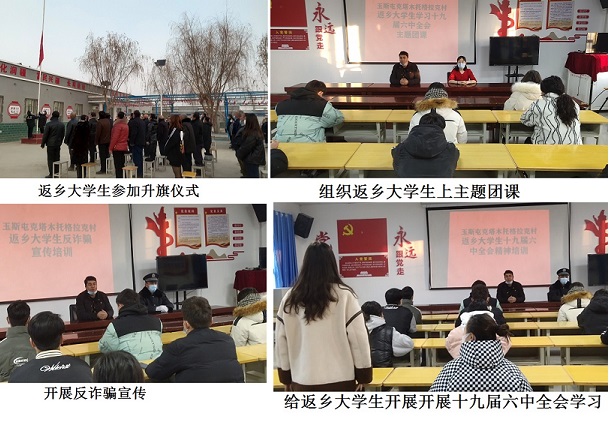 清风网讯(阿克苏检察分院:牛渊渊)寒假来临,大中专学生纷纷返回原籍过寒假,为动员返乡大学生积极参与美丽乡村建设,充分发挥返乡学生知识丰富、思想活跃、充满活力的优势,阿克苏检察分院驻阿瓦提县塔木托格拉克镇玉斯屯克塔木托格拉克村工作队和村“两委”通过宣传学习引导、加强感恩教育、开展志愿服务等系列活动,扎实做好返乡学生管理和服务工作,使每一位返乡学生都能增强责任感,为乡村发展贡献积极作用。