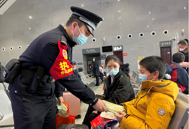 清风网讯(怀化铁路公安处乘警支队:刘燕轻、龙启超)1月17日,是2022年全国春运的首日,怀化铁路公安处松桃车站派出所在候车室内开展多项服务活动,帮助旅客轻松踏上坐车回家的路。