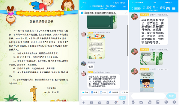 二团幼儿园积极组织教职工学习《反食品浪费法》,并通过家长群发电子倡议书和“反铺张浪费,节约粮食”短视频,宣传节粮爱粮知识,一粥一饭,当思来之不易;半丝半缕,恒念物力维艰,让孩子们从小树立爱惜粮食、节约粮食的意识,引导孩子们以实际行动践行节约精神,培养爱惜粮食、勤俭节约的良好习惯。