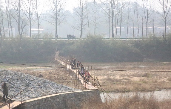 好在每年冬季来临时,村里筹集树木,组织义务工来搭个木桥,让人过河不再受冻,真是一道木桥解忧愁。搭建木桥,先做好木架子固定在河里,再用3根木头平铺绑在架子上,绑上铁丝或巴钉钉住而成,窄而简陋且高低不平。小孩过桥需要大人牵扯着,老人需要年轻人搀扶着,虽然,过桥时摇摇晃晃,胆颤心惊,有尖叫声,也有嬉笑声,经常出现双向而行的人挑着担子在桥上无法避让。当年,村代销店的挑夫挑着一两百斤重的货物,邮递员扶着载有书报信两大包裹的自行车从容不迫的过着桥,也有晕桥人叭着过桥或蹚水过河,甚至出现过有人掉落河中的事。特别是寒冬腊月,那个北风吹、雪花飘的时候,想过桥又怕过桥,怕冷怕打滑,不小心不留神,就会掉进河里,那滋味真难受。看到人们过桥的一幕幕情景历历在目,自己过桥遇风雨、踏冰雪的经历记忆犹新。不管怎么样,大家却没有怨言。毕竟,它是一道爱民桥,可方便了上下左右四五个村数千人的来往进出。