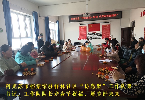 1月28日下午,在新春佳节来临之际,新疆阿克苏市档案馆驻实验林场祥林社区“访惠聚”工作队积极组织社区干部、结亲户、居民代表30余人欢聚一堂、畅叙情谊、共迎新春。