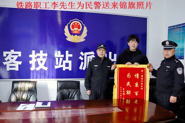 清风网讯(呼和浩特铁路公安处:李岩、张璐) 近日,李先生来到呼和浩特铁路公安处客机站派出所,将一面写有“情系百姓 为民解忧”的锦旗献给了帮其找回手机的民警,“要是没找到,年也过不好了,真是多亏了你们。”李先生对民警的热心帮助表示感谢。