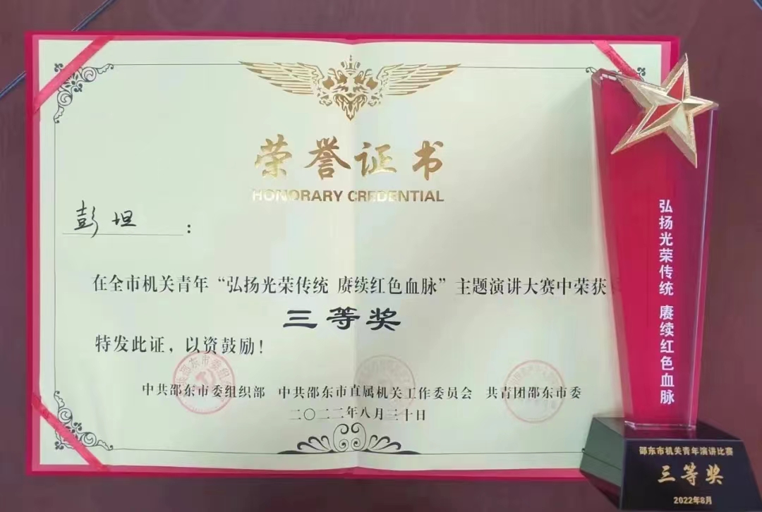 “此次能够代表邵东市卫健系统参加比赛,对我来说不仅是一份荣誉,更是一份责任。通过比赛,让更多的人了解了我们防疫期间执甲奋战的故事,还拿到了三等奖,真的好开心。”8月30日,在湖南省邵东市湘淮村镇银行的会议室,刚参加完决赛拿到邵东市机关青年“弘扬光荣传统 赓续红色血脉”主题演讲大赛三等奖荣誉证书的彭坦,高兴地说。
