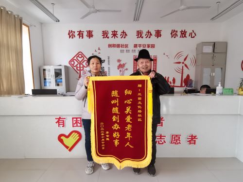 12月13日,家住文化路社区迎宾小区的茅世德老人来到社区便民服务大厅,激动地将一面写有“随叫随到办好事,细心关爱老年人”的锦旗送到社区工作人员的手中,真挚感谢社区工作人员给予的关心和帮助。