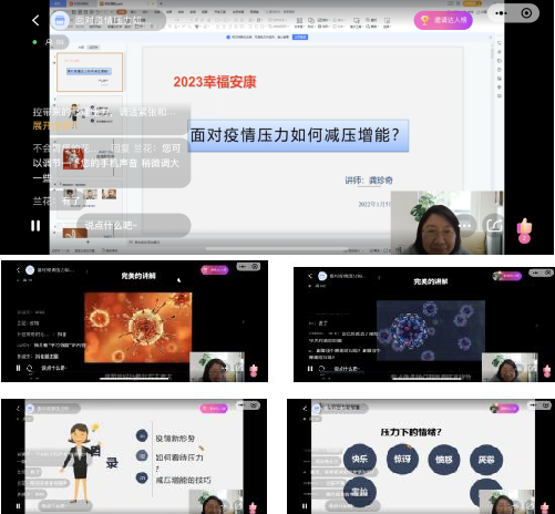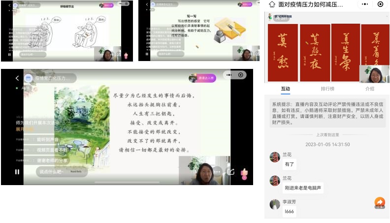 在疫情常态化下的压力与情绪管理讲座中,老师从抗疫新形势、压力与情绪问题、调整方案三个方面详细介绍了如何管理情绪、缓解压力的方法,让居民对如何在疫情期间合理调整心态有了进一步的认识和了解,有效缓解了特殊时期大家的心理压力。老师用通俗易懂的语言,互动式的方式与居民们交流,通过治标治本两种方法告诉大家要适当的宣泄自己的情绪,发展个人爱好和生活情趣,选择健康的生活方式;并提出听轻音乐、慢运动、冥想放松、画画、睡觉等适度排解压力、调解心理的方法,使自己时刻保持积极乐观的心态,有效缓解居民负面情绪,使居民学会合理的情绪管理,在工作和生活中增添幸福感。居民们分享了参与活动的感悟与收获,“感谢街道组织这次活动,通过老师的分享学习收获不少”“非常感谢举办这场讲座,给我们提供了很好的释放压力的机会,效果很明显,感觉时间一下就过去了!”