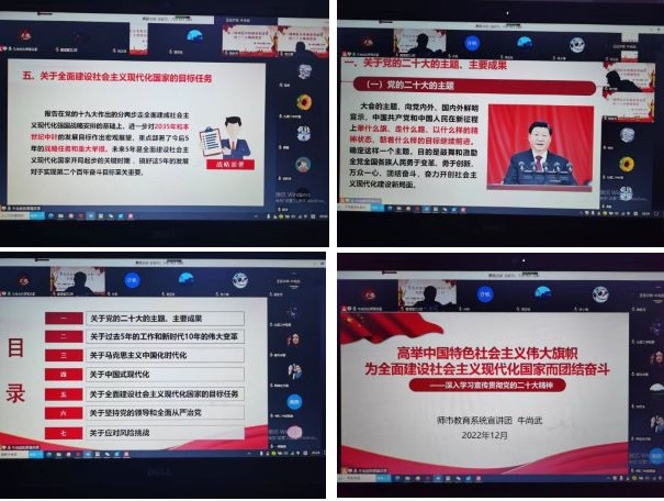 活动中,师市教育系统宣讲团牛尚武教师进行了题为《高举中国特色社会主义伟大旗帜为全面建设社会主义现代化国家而奋斗》的讲座。此次宣讲从党的二十大主题、过去5年的工作和新时代10年的伟大变革、马克思主义中国化时代化、中国式现代化、全面建设社会主义现代化国家的目标任务等内容,为全体教职工学习领悟、深刻理解、准确把握党的二十大精神提供了启发和帮助。