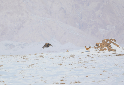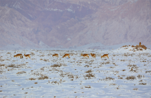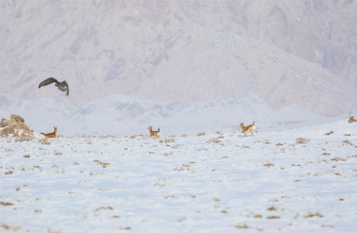近日,笔者前往新疆生产建设兵团第一师阿拉尔市四团游玩途中,偶遇一群在路边雪地里觅食的国家一级保护动物普氏原羚(黄羊),巧的是一只国家二级保护动物苍鹰正在空中盘旋,同框“出镜”尤为难得。