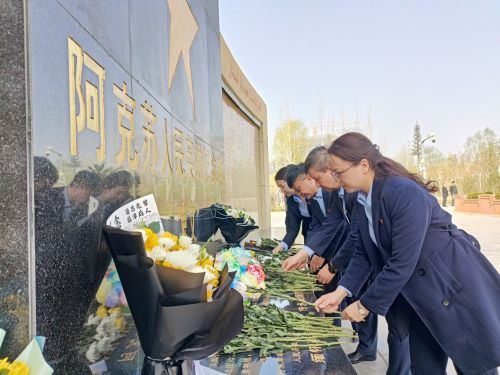 2023年3月30日,温宿农商银行党员职工在阿克苏市人民英雄纪念碑前,向人民英雄敬献鲜花。