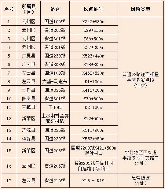 大同交警排查出辖区严重安全隐患和事故多发点段17处,希望驾驶人在途经上述路段时,注意观察,谨慎驾驶,减速慢行。